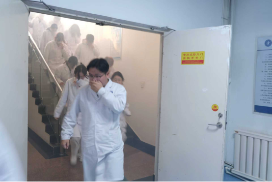 演练高度还原真实火情场景,所在楼宇全体师生严密捂住口鼻,保持弯腰低姿,沿就近消防楼梯,按照指定疏散路线,快速有序撤离至楼外安全区域。撤离后,工作人员立即清点人数,同步对“受伤人员”开展急救处置,并组织人员使用消防器材开展灭火,整个流程衔接紧密、分工明确。