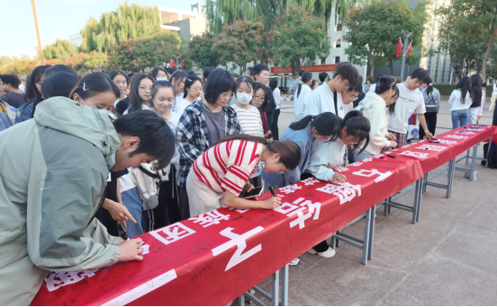 此次活动形式多样、内容丰富,师生们通过知识竞答、趣味竞技、主题签名,在欢声笑语中深化对民族团结的理解,展现青春风采与家国情怀。活动在热烈的民族团结知识竞答中拉开序幕,学院领导围绕民族政策、文化习俗、历史典故等方面选题提问,同学们踊跃抢答,在思维碰撞中加深了对中华民族多元一体格局的认知。全体师生在印有“月满金秋家国盛,石榴结子一家亲”的横幅上郑重签名,以笔墨传递“手足相亲、守望相助”的坚定信念,将活动氛围推向高潮。
