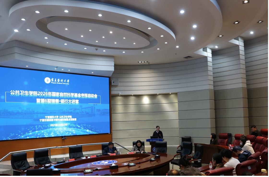 2025年10月13日,公共卫生学院2026年国家自然科学基金申报启动会暨第六期“臻善·砺行公卫大讲堂”在宁夏医科大学正德楼314国际会议厅举行。会议特邀美国路易斯维尔大学公共卫生与信息科学学院终身教授张群卫教授来访交流。学校党委副书记韩蕃璠、学院党委书记杨惠芳、副院长关素珍共同出席此次活动。会议由学院党委书记杨惠芳教授主持,我院60余名师生代表共同参与本次活动。