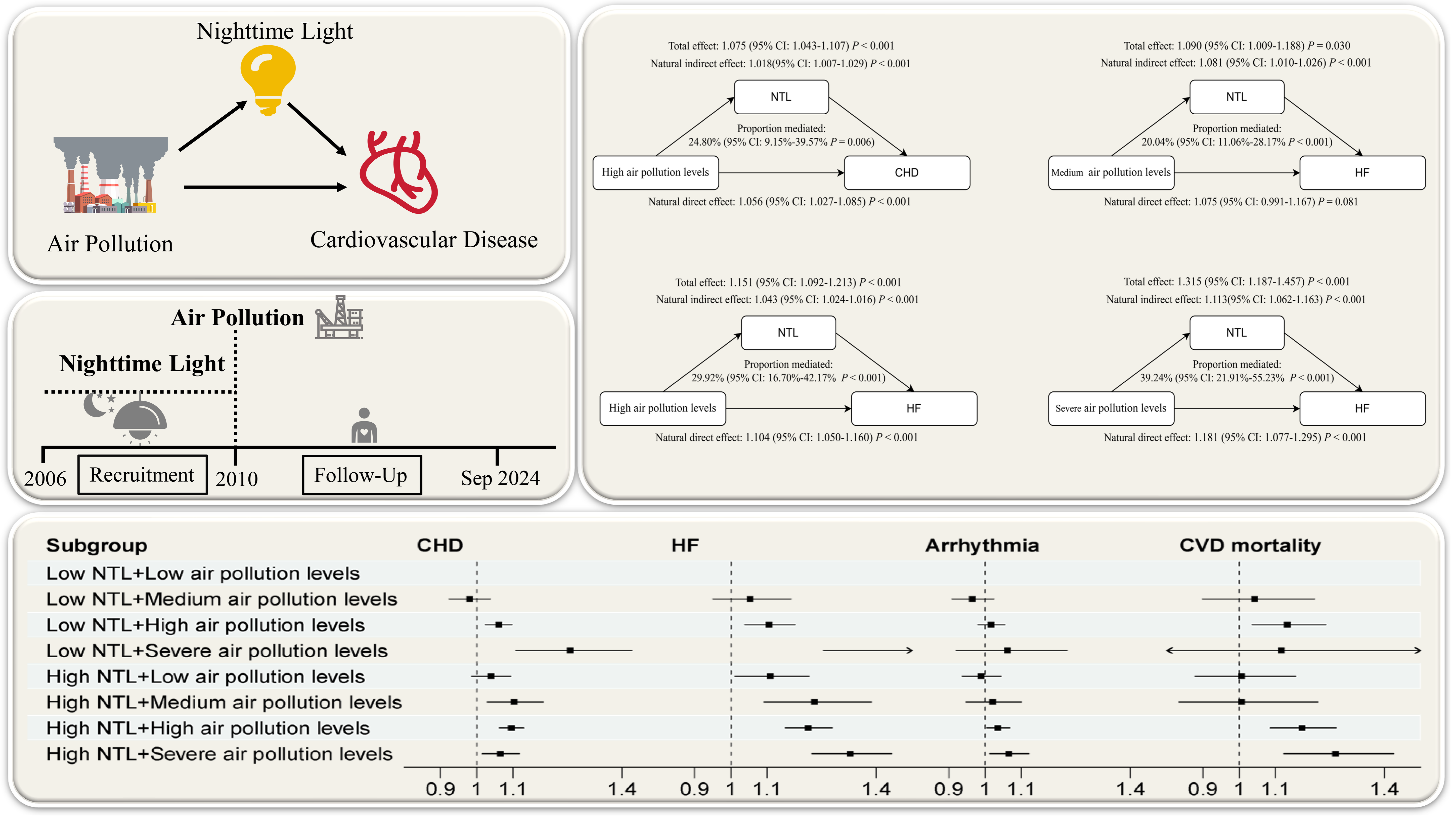 空气污染是心血管疾病及其死亡的重要环境危险因素,但夜间灯光在这一关系中的作用尚不清楚。本研究基于英国生物银行(UK Biobank)队列,纳入416,032名参与者,采用潜在类别分析评估多种空气污染物的联合暴露模式,并结合Cox比例风险回归模型探讨空气污染、夜间灯光与心血管疾病的关联。研究结果显示,无论单一还是联合暴露,高水平空气污染均显著增加心血管疾病风险。具体而言,严重空气污染暴露者的冠心病(HR=1.071,95%CI:1.022–1.121)、心力衰竭(HR=1.318,95%CI:1.218–1.427)、心律失常(HR=1.067,95%CI:1.016–1.121)、全因心血管死亡(HR=1.253,95%CI:1.117–1.406)及中风(HR=1.057,95%CI:1.005–1.111)风险均显著升高。联合分析进一步发现,空气污染与夜间灯光的复合暴露水平越高,心血管疾病风险呈阶梯式上升。中介分析表明,夜间灯光在空气污染对冠心病风险的影响中具有24.80%的中介效应,在心力衰竭风险中的中介比例介于20.04%至39.24%之间。综上,本研究表明,空气污染与夜间灯光均与心血管疾病风险升高密切相关,夜间灯光在空气污染对冠心病和心力衰竭的影响中起部分中介作用,提示应综合考虑多环境因素对心血管健康的协同影响。