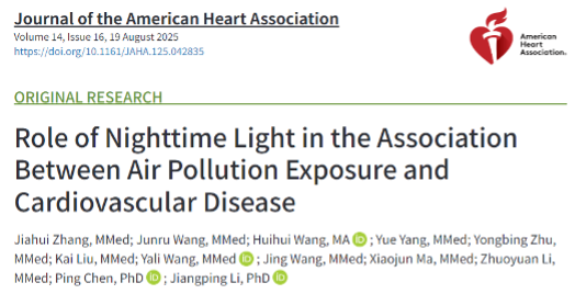 Journal of the American Heart Association:李江平团队研究发现夜间光照是空气污染危害心血管健康的关键调节因素,革新了环境健康风险评估框架。