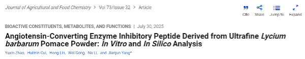 Journal of Agricultural and Food Chemistry:杨建军团队发现超细粉碎可显著提高枸杞渣蛋白水解物的蛋白质含量并增强其ACE抑制活性。