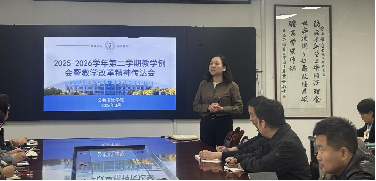 2026年3月24日,公共卫生学院召开2025-2026学年第二学期学期教学工作例会,系统部署近期教学任务,通报教学检查情况,并围绕智慧课程建设与教学激励政策进行深入研讨。学院分管教学领导关素珍、各系主任、及教师代表参加会议。