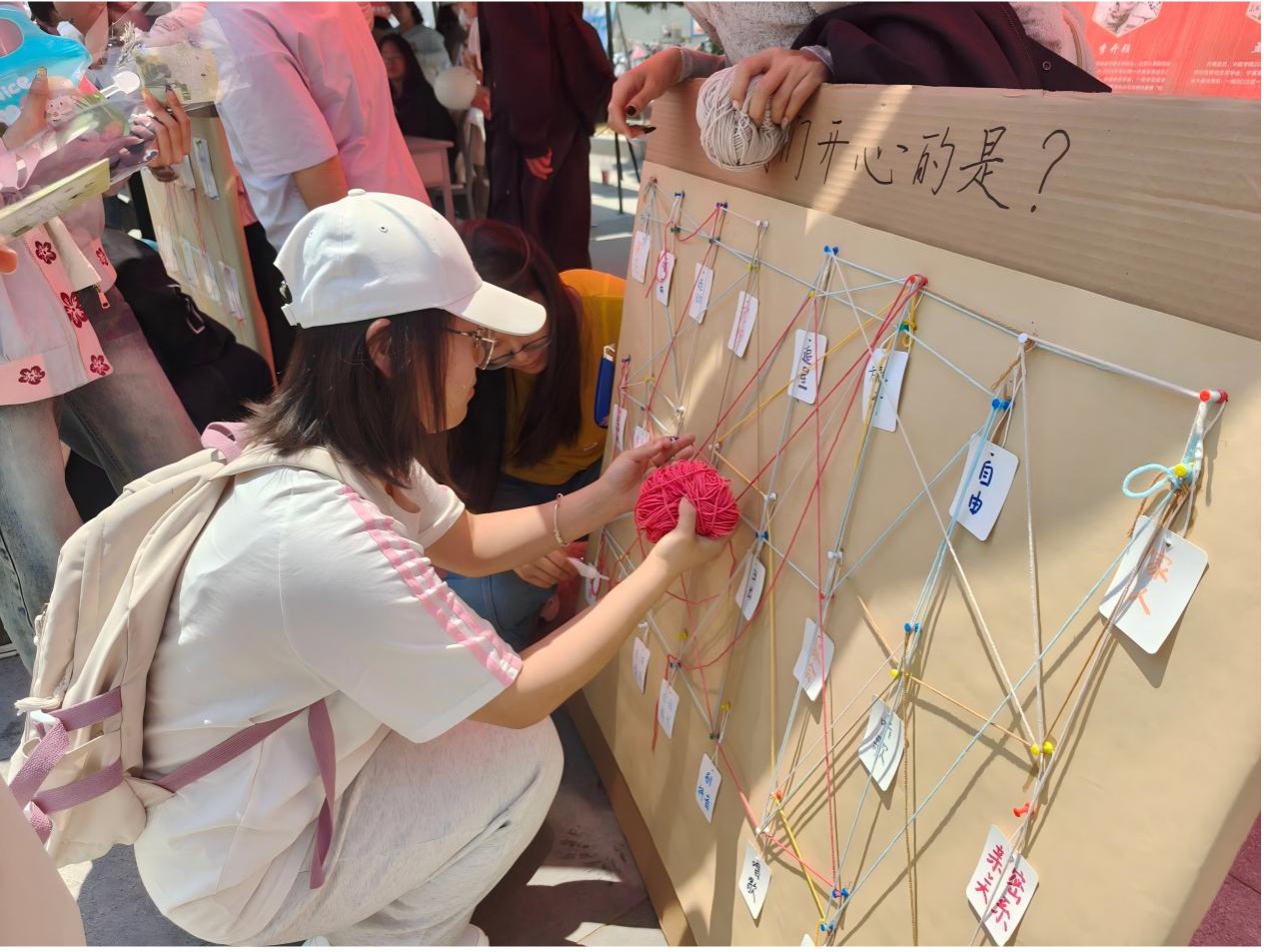 本次活动共设置六大特色环节,吸引了来自各个学院的同学踊跃参与。在“心晴树洞”环节,同学们随机抽取心理学题目并作答,系统了解心理健康常识;“能量补给站”以拥抱或击掌等温暖的肢体接触,传递情感温度;“坏情绪垃圾站”将负面情绪以仪式感完成情绪释放;“生命中的彩虹”鼓励同学们用颜料自由涂鸦,在创作中舒缓压力;“What makes me happy?”通过图钉与毛线制作“快乐地图”,将积极愿望转化为具象坐标。各环节紧密围绕夏季元素与心理疗愈内核,形式新颖、内容充实,让同学们在趣味互动中实现情绪调节与心态升级。