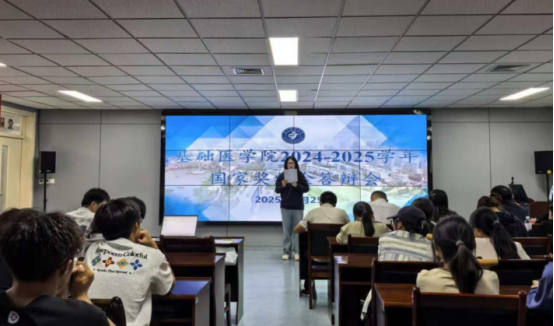 为全方位、深层次推进2025级本科新生入学教育工作,大力强化优良学风建设,9月25日,基础医学院精心策划并组织了一场别开生面的本科生国家奖学金答辩会,特别邀请 2025级全体新生现场观摩,为初入校园的学子们呈上了一堂极具感染力与启发性的“成长励志课”。学院分管学生工作领导、教师代表、辅导员老师一同参加。
