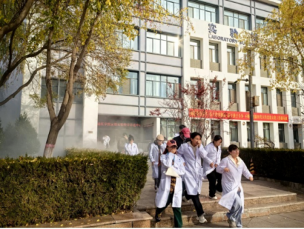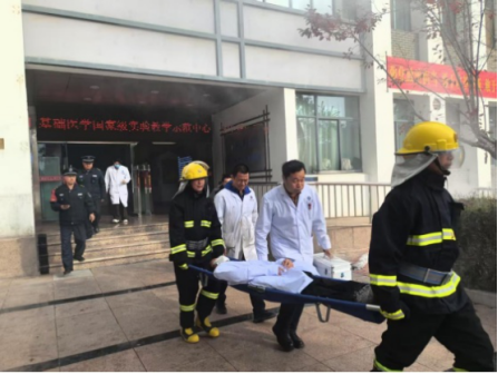 上午10时,随着实验楼内模拟火点的烟雾升起,实验技术教师随即按响楼道警报,演练正式启动。教职工迅即启动应急预案,组织学生紧急疏散。学生在教师引导下,迅速用衣袖捂住口鼻,低姿弯腰,沿右侧消防通道快速有序撤离至安全地带。演练中还模拟了伤员救助场景,在消防员和医生的协同护送下,一名模拟伤员被安全转移至楼外实施救治。基础医学院党委书记张艳丽在疏散演练总结中指出,安全工作要始终防患于未然,此次活动是党建工作与安全生产实际深度融合的重要举措,有效提升了师生安全意识和应急处置能力。