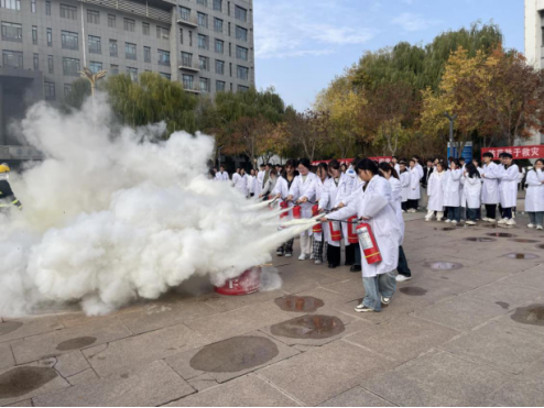 随后,保卫处消防科科长杨俊康现场讲解消防安全知识,并详细演示了消防器材操作技能。操作中,他用水基灭火器将其手部喷湿后,现场用火点着手面,生动演示了灭火器的阻燃效果,引得师生惊呼,现场反响热烈。在现场专业指导下,师生们踊跃参与实操练习,迅速掌握了灭火器等器材的使用方法。