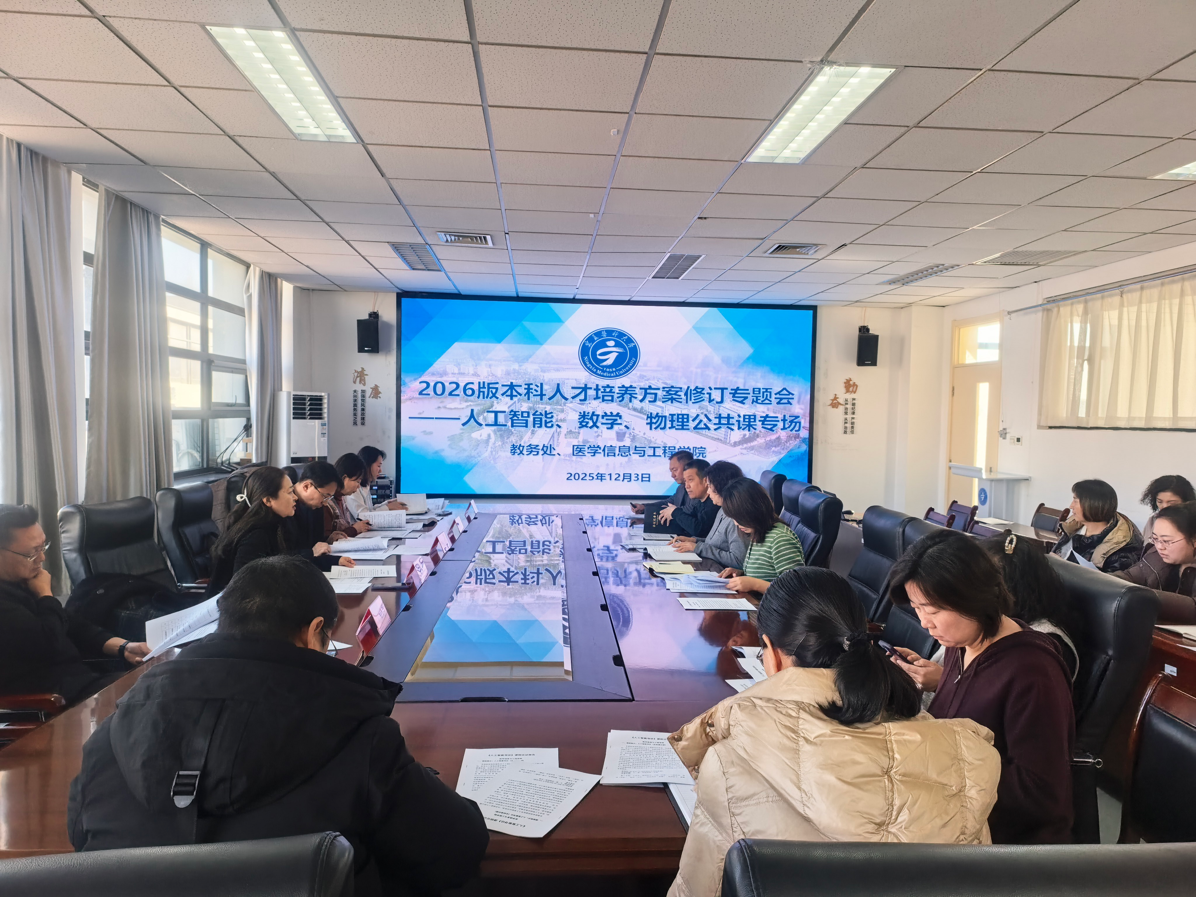为扎实推进2026版本科人才培养方案修订工作,筑牢人才培养根基,同时为人工智能技术全面融入公共课教学铺好路、搭好桥,12月3日,2026版本科人才培养方案修订会—人工智能、数学、物理公共课专场顺利举行。会议由教务处处长主持,数智建设与管理中心主任、医学信息与工程学院相关院领导、教务处相关工作人员及各课程负责人参会,特邀宁夏大学信息工程学院信息技术教学部副主任莅临指导。