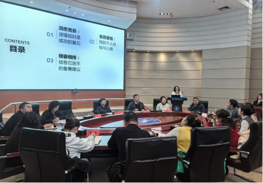 会上,教师发展与教学质量监控中心负责人介绍了赛前培育工作方案,对两项赛事的最新赛制规则、备赛重点等进行了解读,结合学校教学改革实际,进一步强调了竞赛在推动教师教学能力提升及教学创新中的意义。医学信息与工程学院袁晶教授、药学院樊艳茹教授作为往届赛事的优秀选手,围绕“读懂竞赛规则”“打磨教学内容”“创新教学方法”等分享了经验心得,为参赛教师提供了备赛思路。杨怡在总结时讲到,教学竞赛是加强教师队伍建设、提升育人成效的重要平台。全体参赛教师要以此次赛事为契机,深耕教学、创新实践,在交流学习中夯实教学基本功、提升教学创新水平。各相关部门(单位)要强化协同联动,做好服务保障工作,确保赛前培训指导工作取得实效。