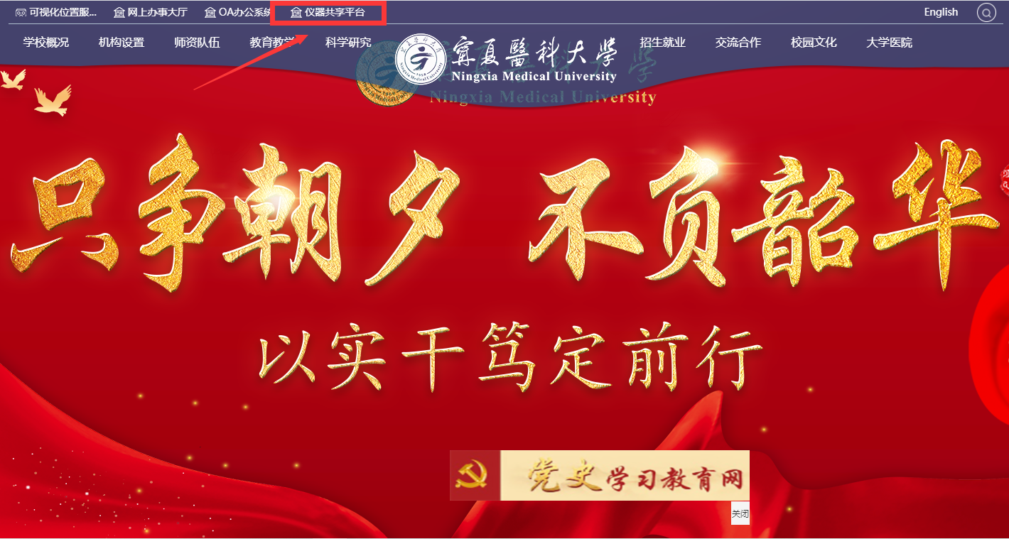 第一步 打开系统:请用谷歌浏览器输入网址:http://www.nxmu.edu.cn/,进入学校官网主页,请点击左上角仪器共享平台进入大型仪器共享管理平台首页。