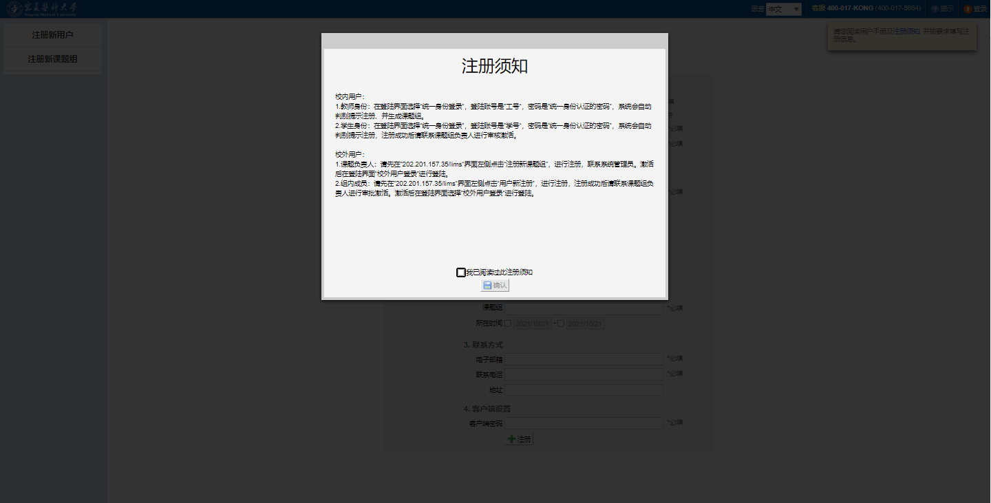 第三步 点击注册之后,请联系课题组导师进行激活确认,激活通过之后便可以进入系统。