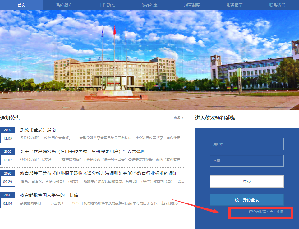 大型仪器共享管理系统是面向校内、社会进行仪器共享、有偿使用服务,为了满足校内师生和校外用户需求系统提供了两种登录方式: