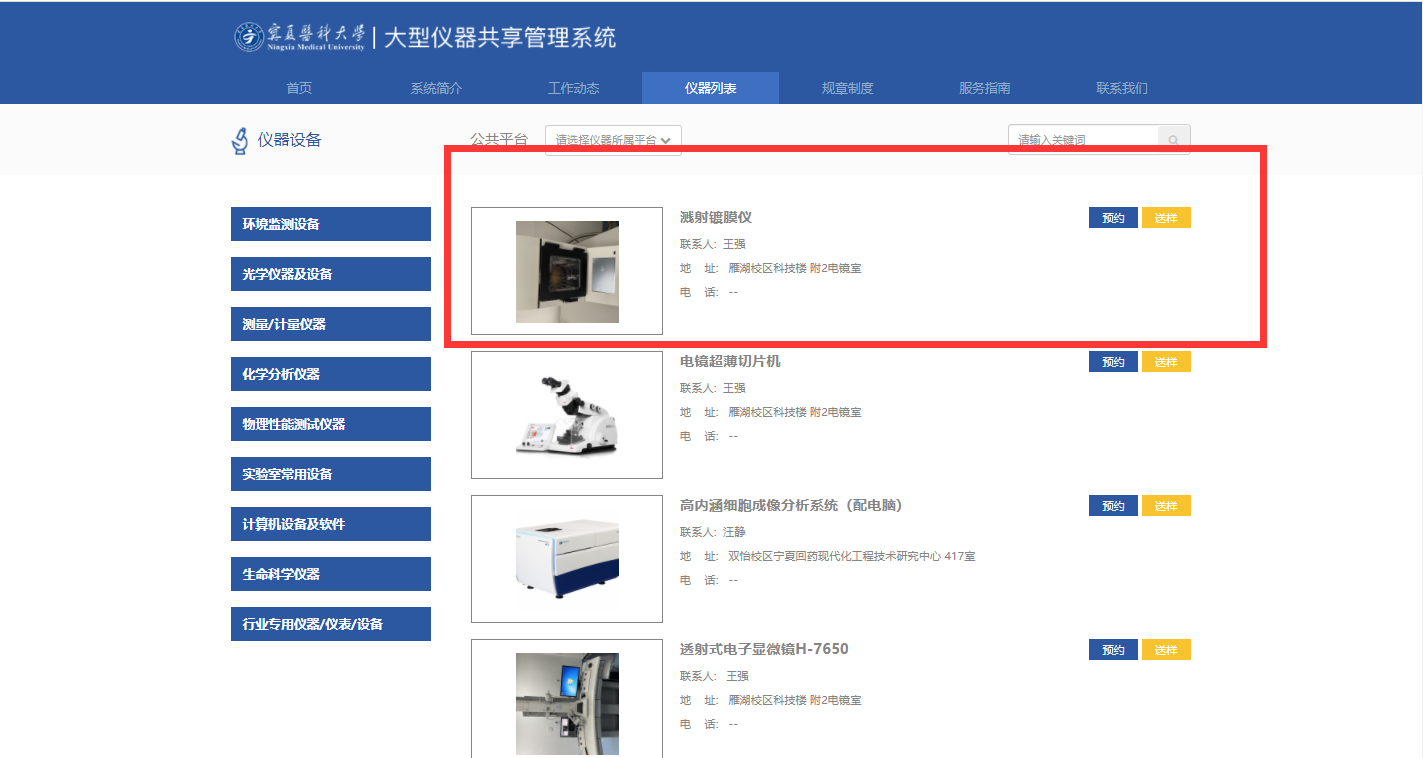 进入大型仪器共享管理平台首页,点击系统首页仪器列表栏目。进入仪器列表页面,显示仪器设备相关信息(仪器名称、联系人、地址、电话),也可对所需使用的仪器进行预约、送样。