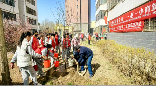 活动现场老少结对、分工协作,银发党员与少先队员两两一组、默契配合。大家纷纷拿起铁锹、水桶,挥锹铲土、挖坑栽苗、培土围堰、提水浇灌,每一个环节都一丝不苟、井然有序。老党员们耐心指导孩子们规范植树,分享植树护绿的知识与经验;孩子们认真聆听、积极动手,用稚嫩的双手为新苗培土浇水,脸上洋溢着劳动的喜悦。欢声笑语间,一株株充满生机的树苗迎风挺立,为家属院增添了浓浓绿意。