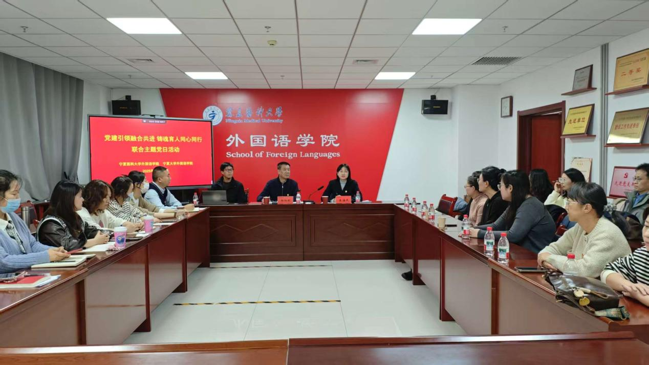 11月26日,学校外国语学院与宁夏大学外国语学院在学校雁湖校区联合开展“党建引领融合共进 铸魂育人同心同行”主题党日。宁夏大学外国语学院党总支书记朱海燕及党员教师代表,我校外国语学院全体班子成员及教工第一、二党支部全体党员参加。