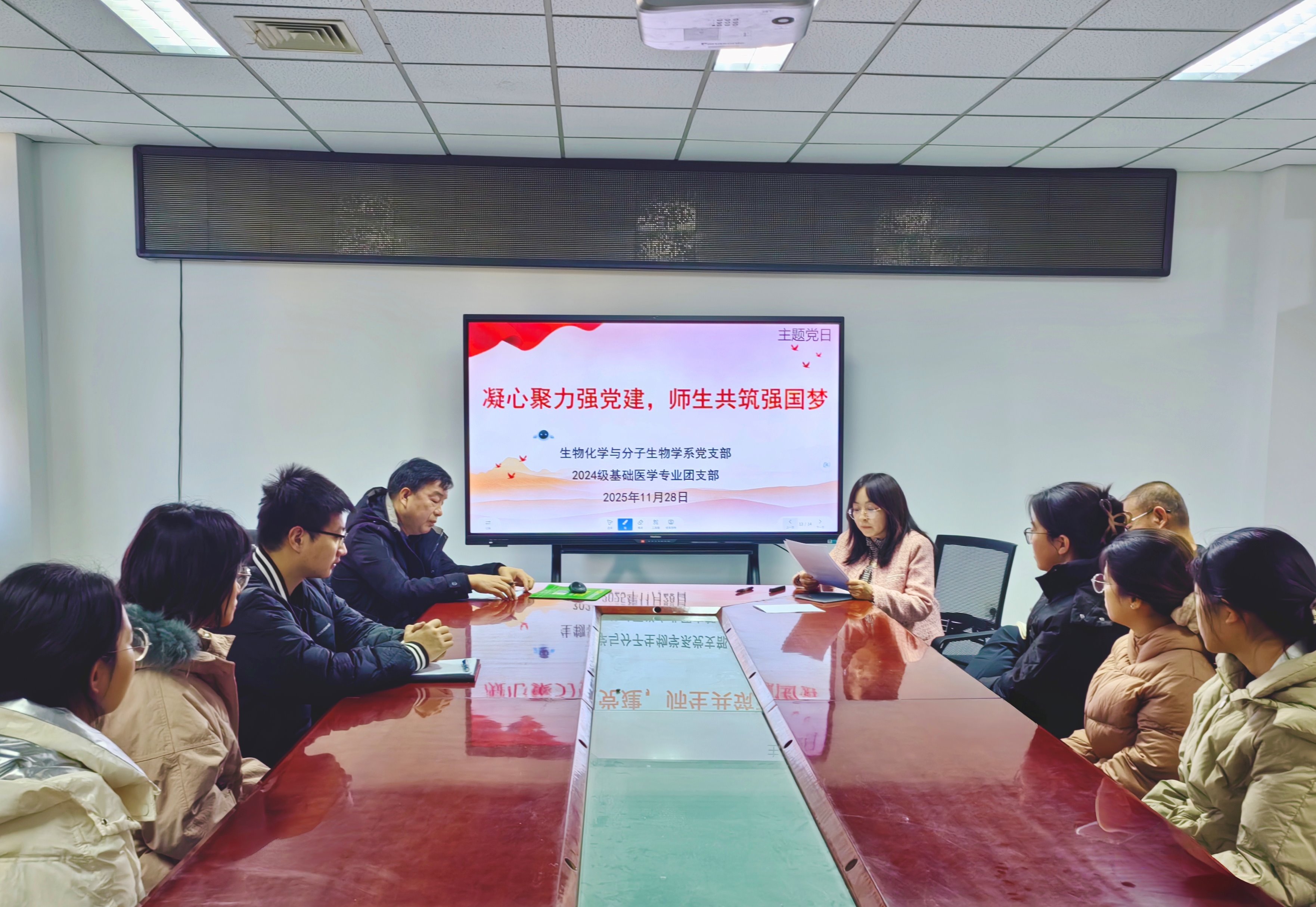 11月28日,基础医学院生物化学与分子生物学系党支部与2024级基础医学创新班团支部在厚生楼320会议室开展“聚焦学情促提升 党建赋能育新人”党建带团建主题党团日。