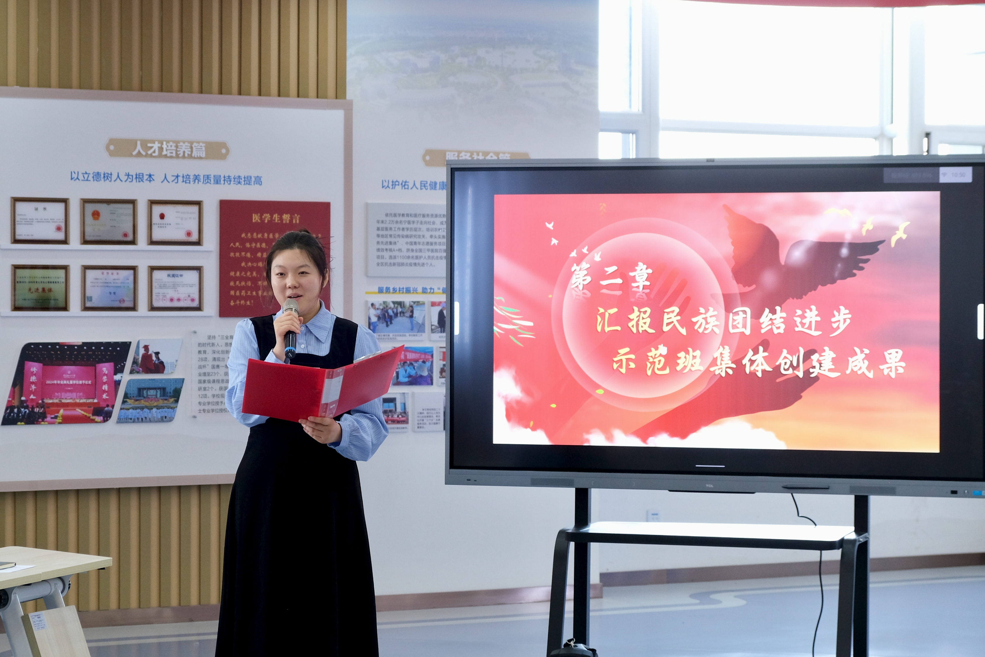 班会上,师生们集中观看了党的二十届四中全会精神学习视频,通过权威解读深化了对全会精神核心要义的理解。班级团支部书记潘妍晨同学以“石榴花开结同心,精诚铸就大医魂”为主题,紧紧围绕民族团结进步示范班集体创建要求,通过“团建助学”“中医药科普”等特色活动案例,充分展示班级全年学习成绩提升、开展各类文体活动、志愿服务的收效,生动诠释了“各民族像石榴籽一样紧紧抱在一起”的团结内涵。
