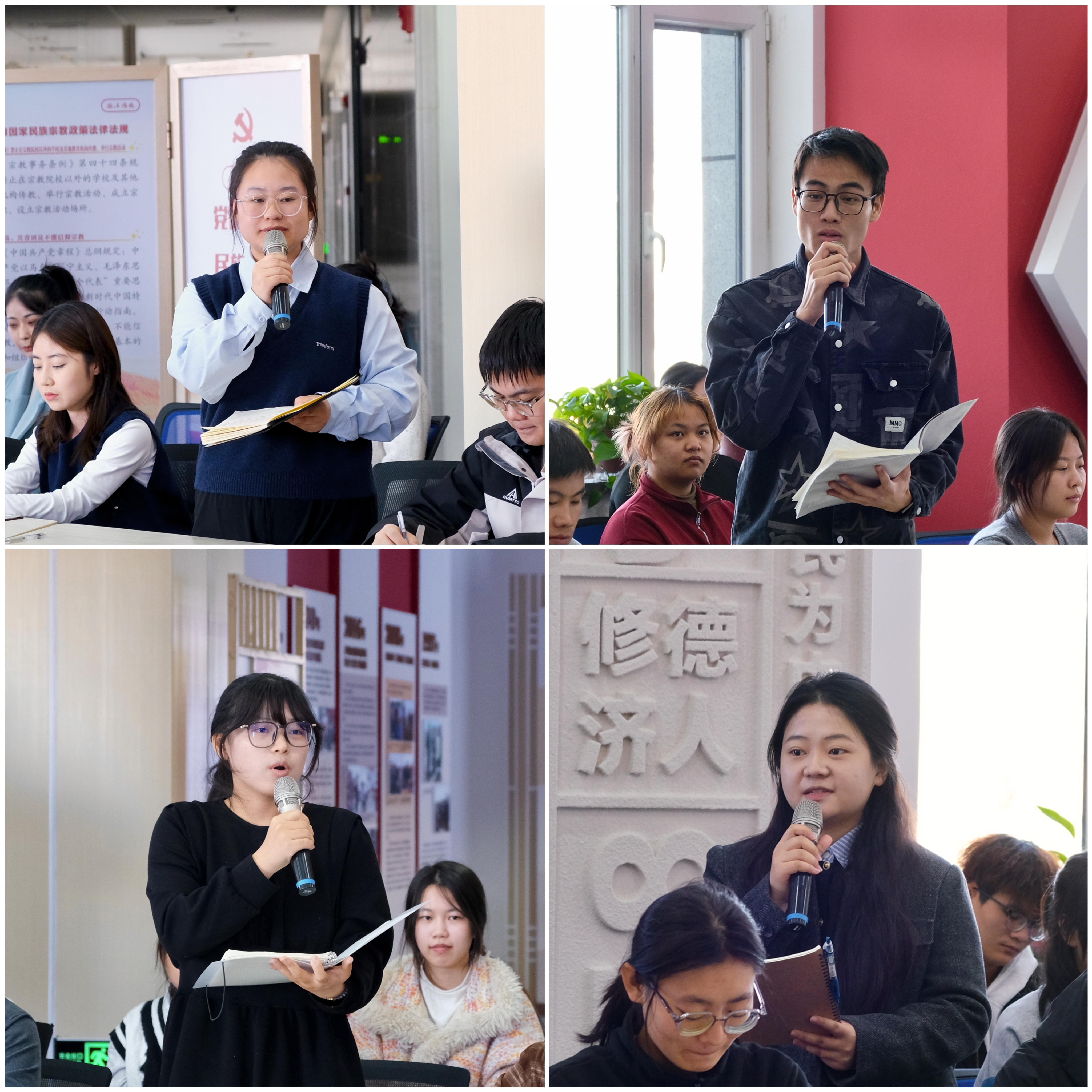 在交流发言环节,黄铭珂、薛乐、张慧娟、陈玉4位同学围绕学习党的二十届四中全会及自治区党委十三届十一次全会精神,结合专业学习,畅谈感悟。