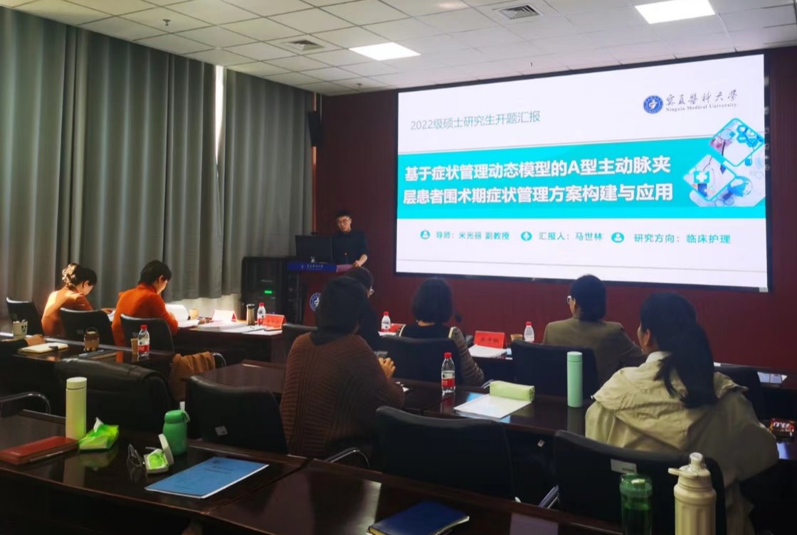 2023年10月18日-2023年11月1日,护理学院分三批次组织开展2022级硕士研究生开题报告工作。郑州大学护理学院张艳教授,宁夏医科大学护理学院副院长田玉梅教授、王艳荣教授,总医院张曦教授、丁雯主任护师,自治区人民医院梁沛枫主任医师、葛玉荣主任护师、赵丽丽主任护师,宁安医院马欣荣主任医师担任此次开题报告的评审专家,所有在校研究生及指导教师到场参会,新晋导师现场观摩学习。 2022级硕士研究生就本次开题报告充分准备,详尽汇报了课题选题立意、研究目的、研究方法、研究现状、创新点、可行性、进度安排以及预期成果等内容。评审专家根据开题报告的背景、结构框架、创新性、可行性等具体内容并结合临床实践情景给予专业的建议和指导。 最后,李兆君副院长对硕士研究生的开题报告进行总结,指出硕士论文开题报告评价是对拟启动课题研究前的优化改进,对研究进展是否顺利至关重要,也是提升研究生科研意识和素养的良好契机。通过评审专家提出的建议和意见,研究生不仅梳理清楚了研究思路,进一步明晰了课题的研究意义,寻找出研究设计的不足,进而查漏补缺,以此确定并解决研究阶段出现的难点问题。