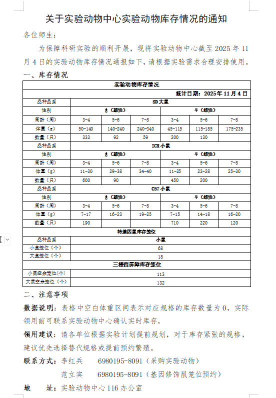 关于实验动物中心实验动物库存情况的通知(第十周)