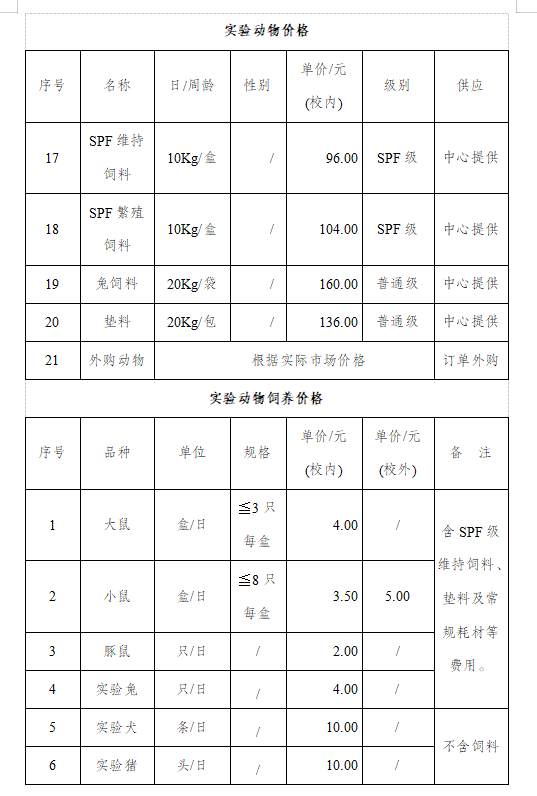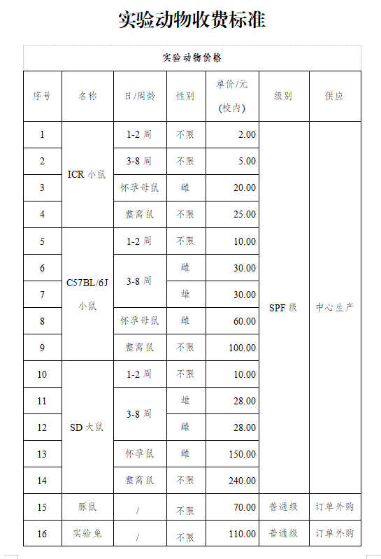 实验动物收费标准-实验动物中心