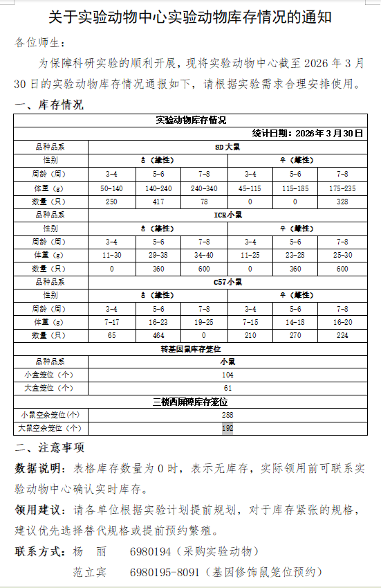 关于实验动物中心实验动物库存情况的通知(2025-2026学年第二学期第5周)