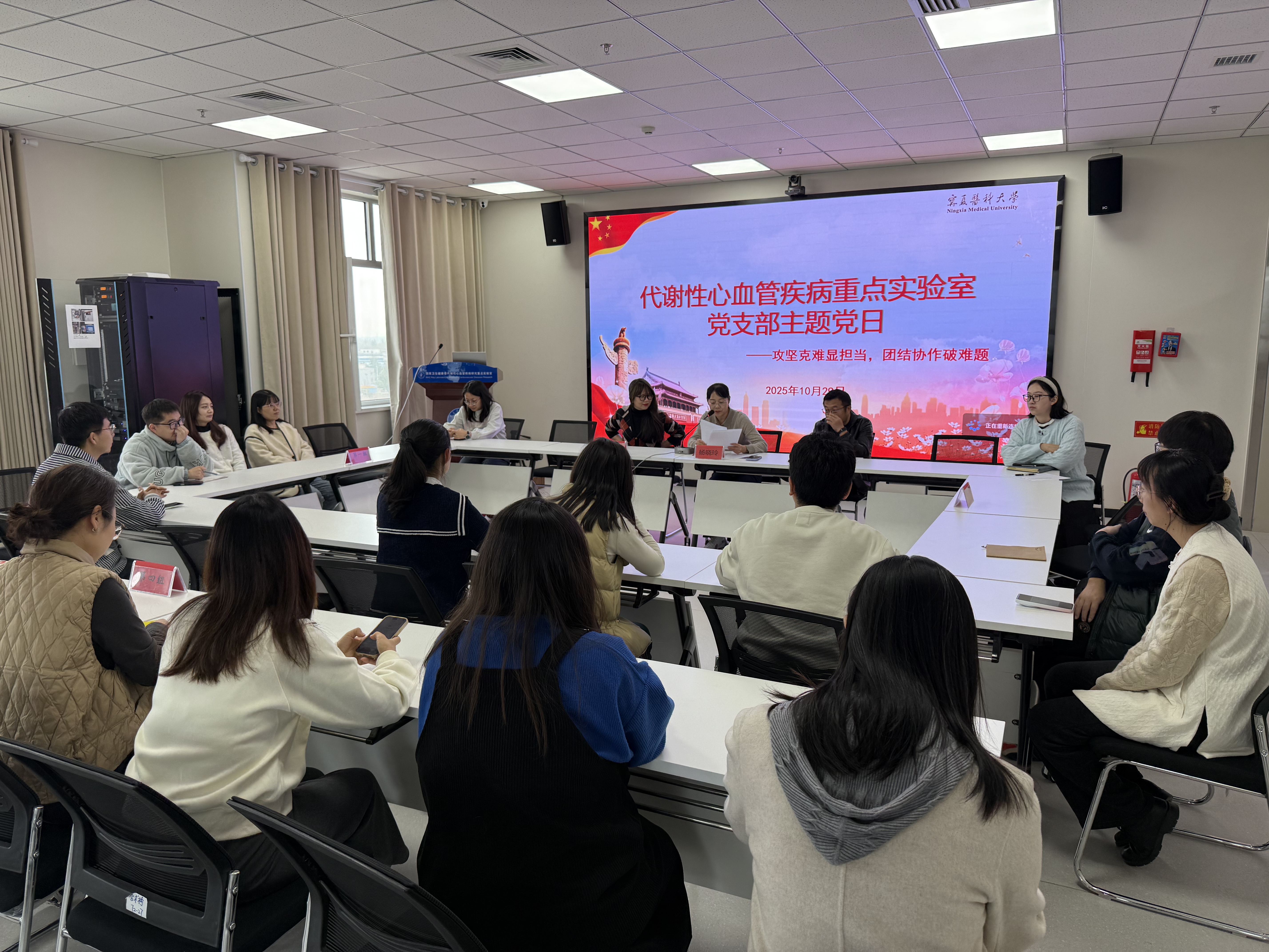 为丰富支部组织生活形式,缓解科研工作压力,激发团队创新活力,2025年10月29日中午,宁夏医科大学代谢性心血管疾病研究重点实验室党支部在砺行楼702学术报告厅举办了以“科研智慧,团队力量”为主题的党支部特色趣味活动。实验室副主任李南、张鸣号教授及全体教师党员与学生党员共计26人参加了本次活动,活动由党支部书记杨晓玲教授主持。