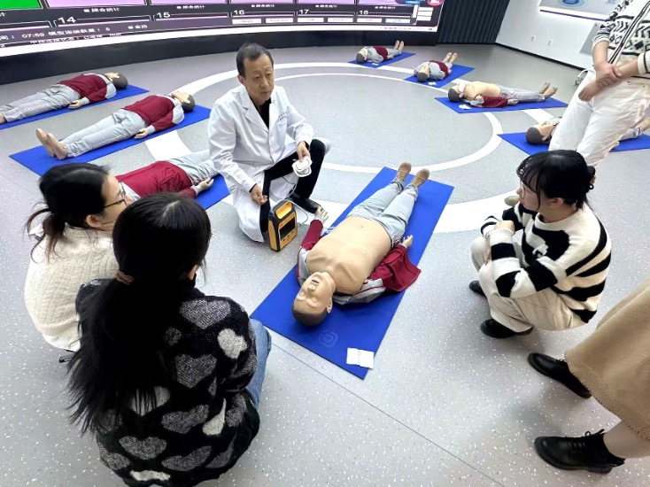 本次培训特别聚焦心肺复苏(CPR)、海姆立克急救法及自动体外除颤仪(AED)的使用等急救技能,护理学院候晓辉教授详细讲解了每种急救技能的应用场景、操作流程及关键要点。如,心肺复苏从判断意识、呼叫救援、胸外按压、开放气道到人工呼吸的精准步骤,并针对胸外按压的深度、频率、手势以及人工呼吸的正确方法逐一拆解说明,利用模拟人教具进行现场演示,参训人员分组进行实操练习。