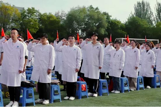 典礼中,基础医学院教师马占兵博士结合自身学习体会就数字技术对教学的深刻变革讲到,从显微镜观察细胞到虚拟仿真“走进”细胞、从板书罗列到互动实时教学,带给学生们更多生动学习的空间,鼓励大家以技术为翼、人文为根、信念为舵,在宁医锤炼成长,书写医者传奇。2025级中西医临床医学创新人才培养班许家豪同学带着对医学事业的向往,跨越千里奔赴宁夏医科大学,“作为一名崭新的“宁医人”,我感受到了时代的责任和青春的召唤”。2025级麻醉学专业博士研究生赵娜同学以麻醉领域名言与大家共勉:“好的麻醉,是让患者忘记疼痛;好的科研,是让世界记住价值。”她希望追逐学术的高度,扛起“健康防线守护者”的使命,努力成长为破解临床难题、推动医学进步的开拓者。高年级学生代表为新生佩戴了校徽。教务处处长徐涛教授带领全体新生领誓《医学生誓言》。全体师生共同起身奏唱校歌《雁湖情》。
