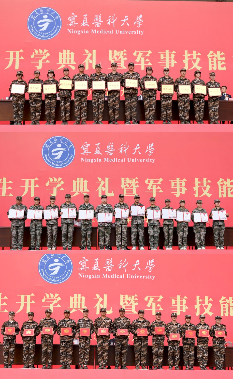 在军事技能训练汇报会环节,国旗班方队、红旗方队、持枪方队等13支分列式方队踏着整齐的步伐,斗志昂扬地通过主席台接受检阅,嘹亮的口号响彻整个校园。军体拳、刺杀操、匕首操等方阵带来了精彩表演,一套套动作干净利落、铿锵有力,充分展现出宁医学子的精神气魄和青春风采。2025级宁医学子将带着使命与担当,在医学道路上砥砺前行,为守护人民健康、助力医疗卫生事业发展贡献青春力量。