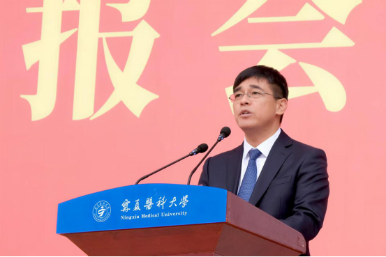 伴随着雄壮的国歌,五星红旗冉冉升起,开学典礼正式拉开帷幕。姜怡邓以《砥砺青春多壮志、奋楫扬帆赴新程,做“敢想敢为梦想成真”的新时代宁医人》为题,回顾了学校的发展历程和当前学校各项事业取得的成绩,寄语同学们不负青春、刻苦学习、立志报国。他讲到,要厚植家国情怀、勇担时代使命,在时代浪潮中,锚定方向、挺膺前行。把爱国之情转化为报国之行,立志听党话、跟党走,立志扎根人民、奉献国家,传承宁医人医路报国的赤诚情怀,向英雄学习、向前辈学习、向榜样学习,争做堪当民族复兴重任的时代新人。要深耕专业领域、践行医者初心,在知行合一中,锤炼本领、守护生命。树立终身学习的理念,不断提升自身医学技能,以“医者仁心术者匠心”,治愈病痛,关爱患者。要拓展创新思维、学会协同合作,在科技迭代中,抢抓机遇、迎难而上。主动拥抱智能科技,始终保持对未知的好奇和对真理的追求,不断突破“医学已知”、探索“生命未知”。