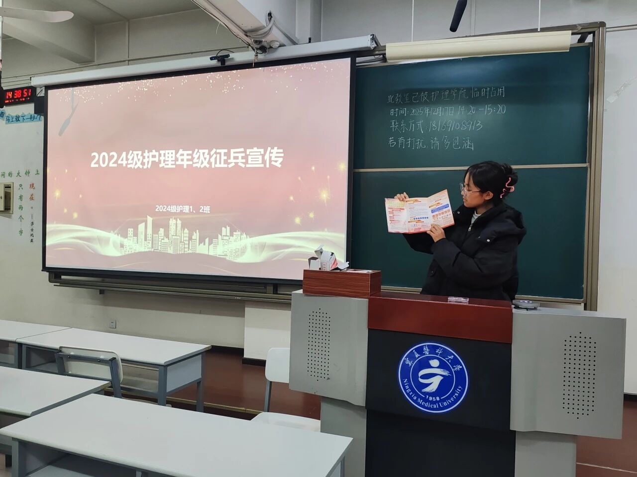 为积极响应国家征兵号召,厚植家国情怀、激发报国热情,12月17日,护理学院2024级护理1班在应谦楼319教室组织开展了“携笔从戎赴军营,青春报国正当时”征兵主题班会,引导同学们深入了解征兵政策,鼓励大家在青春赛道上勇担使命、报效国家。