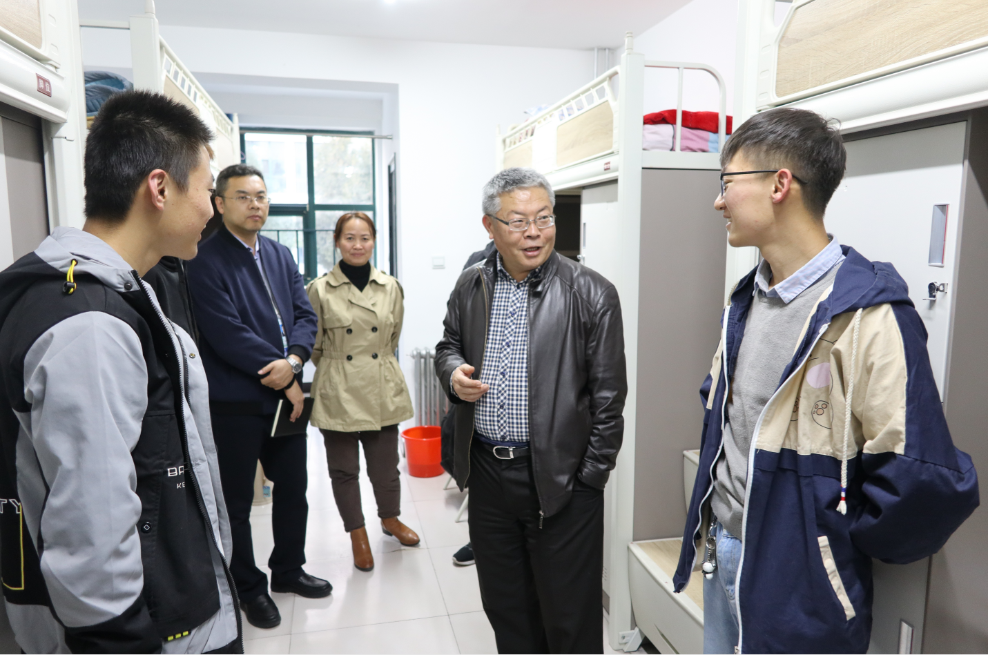 11月9日,学校党委副书记朱建华带领学工部、研工部、保卫处、后勤管理处、中房物业等部门负责人走访了雁湖校区2020级新生宿舍。