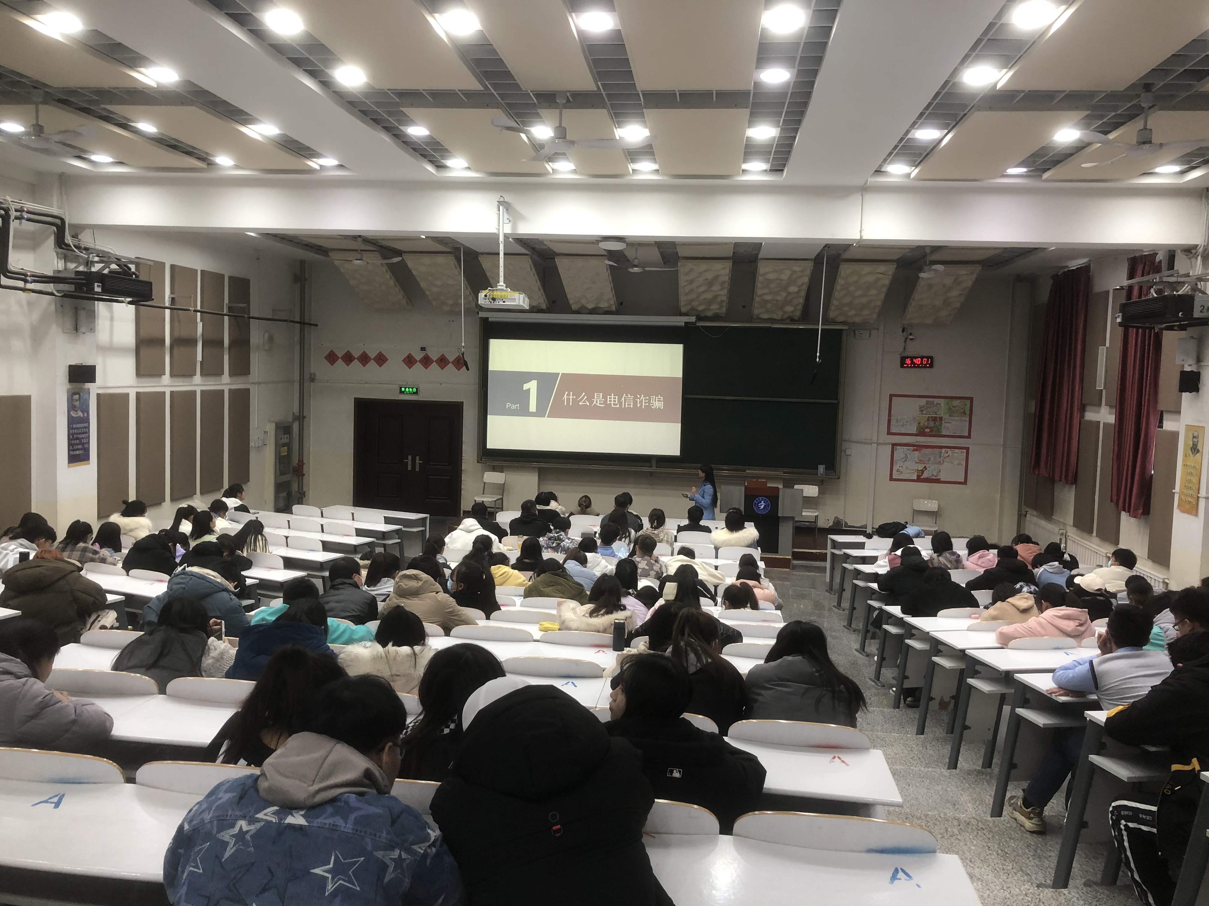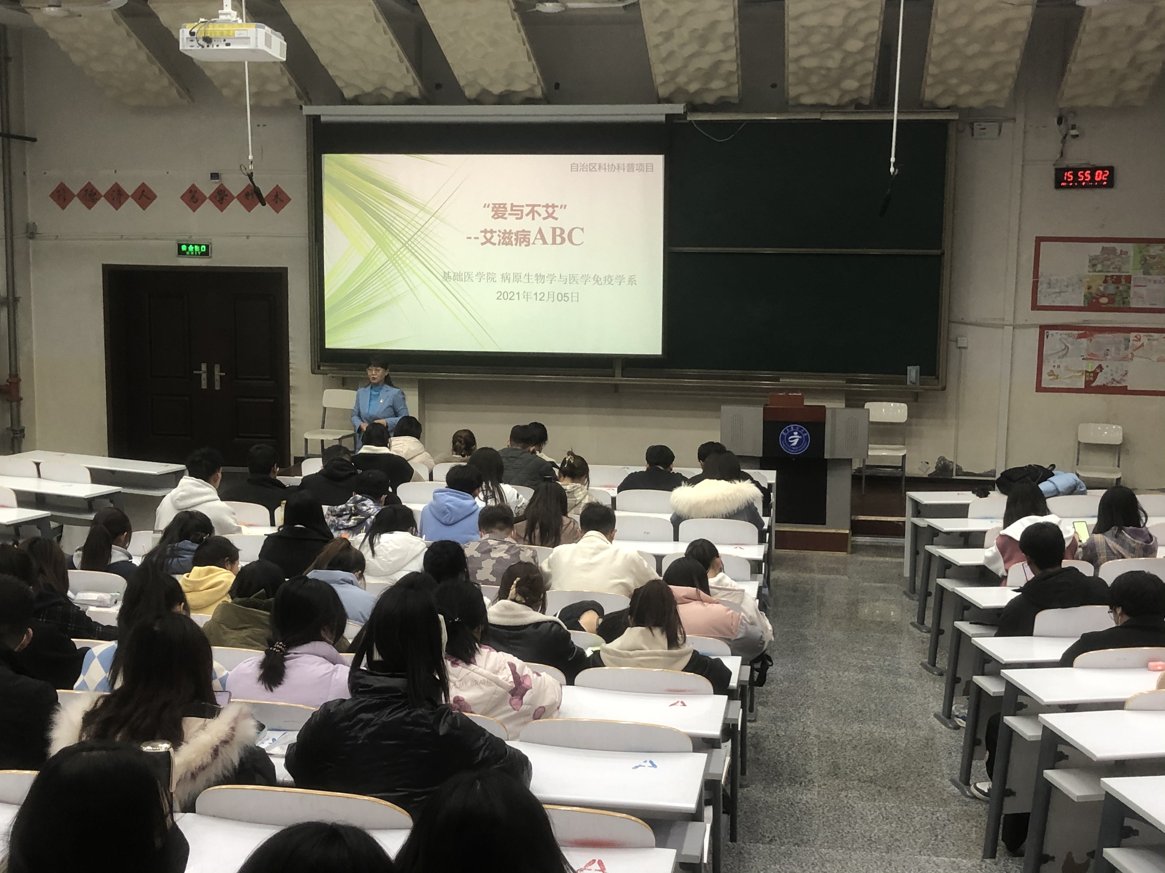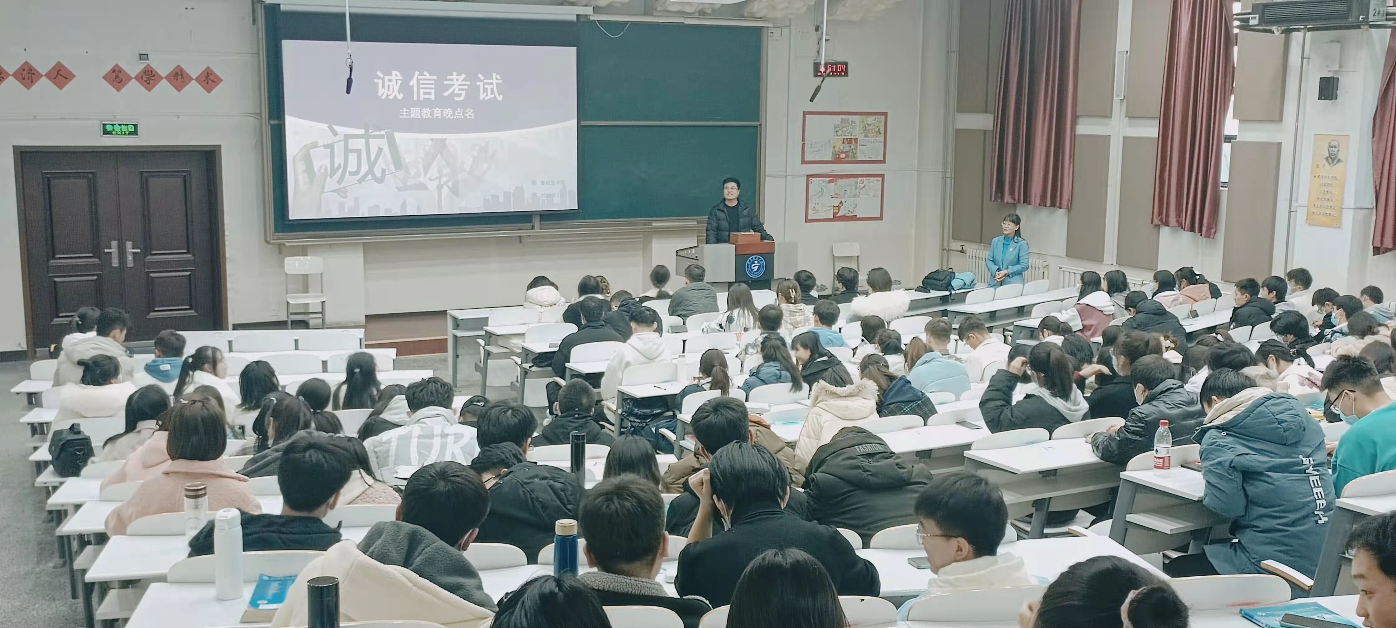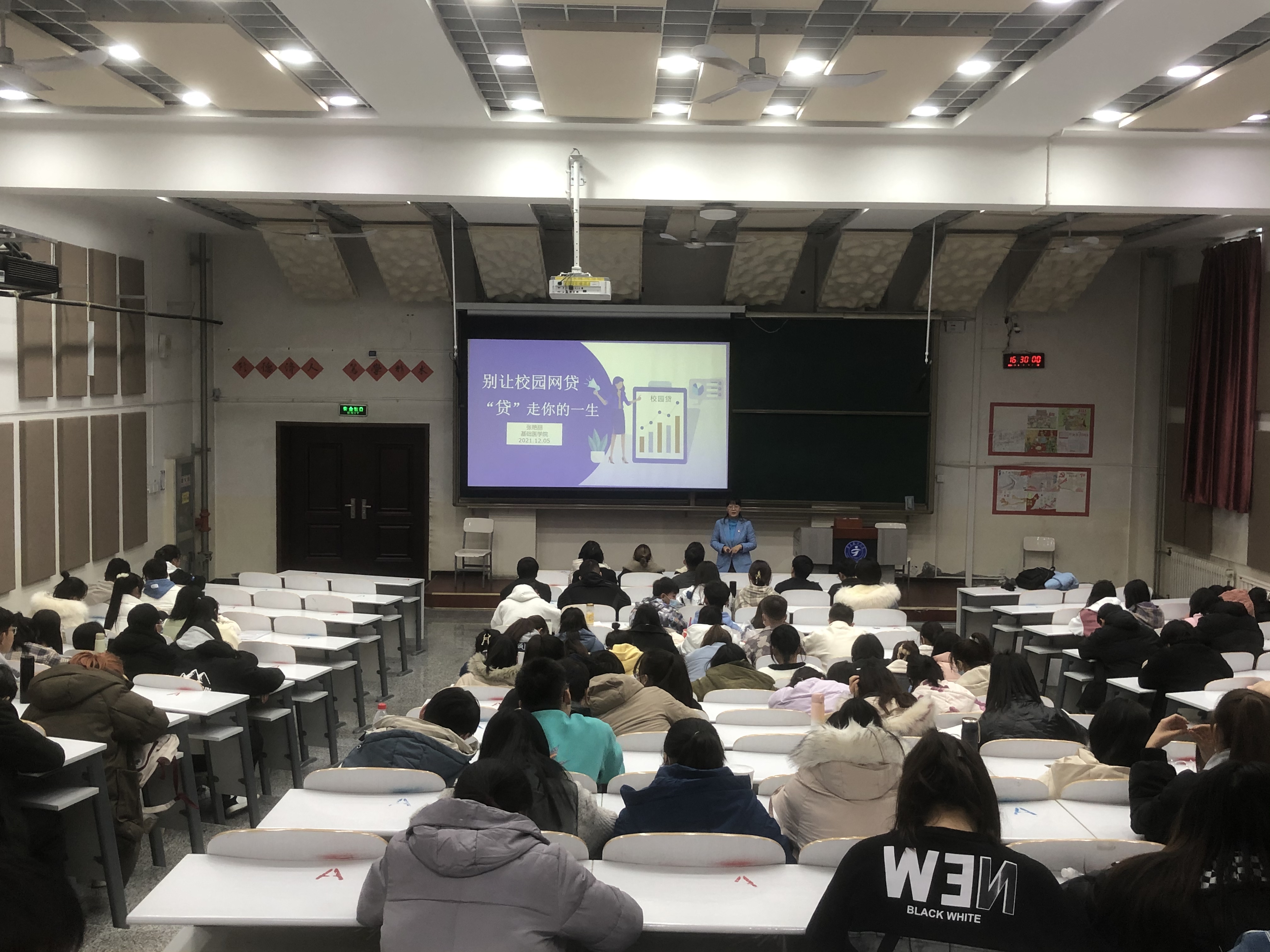 2021年12月6日下午,基础医学院组织全体本科生在应谦教学楼104大教室,开展了预防艾滋病、校园贷和电信诈骗及诚信考试主题晚点名活动。活动由辅导员张慧主持。