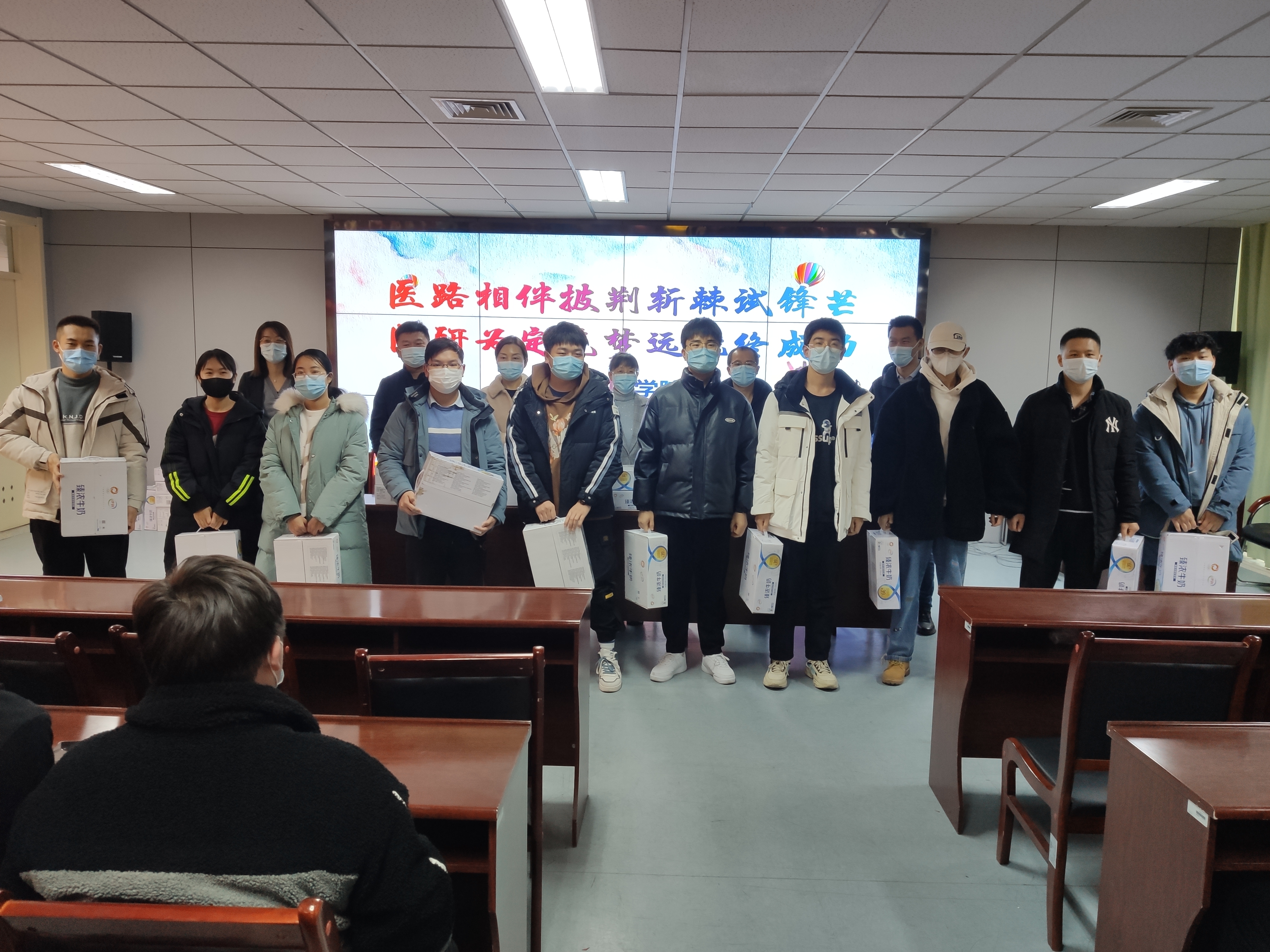 12月4日下午,基础医学院驻校领导老师在厚生楼三楼党员之家,一同慰问考研留校的2023届本科毕业生。