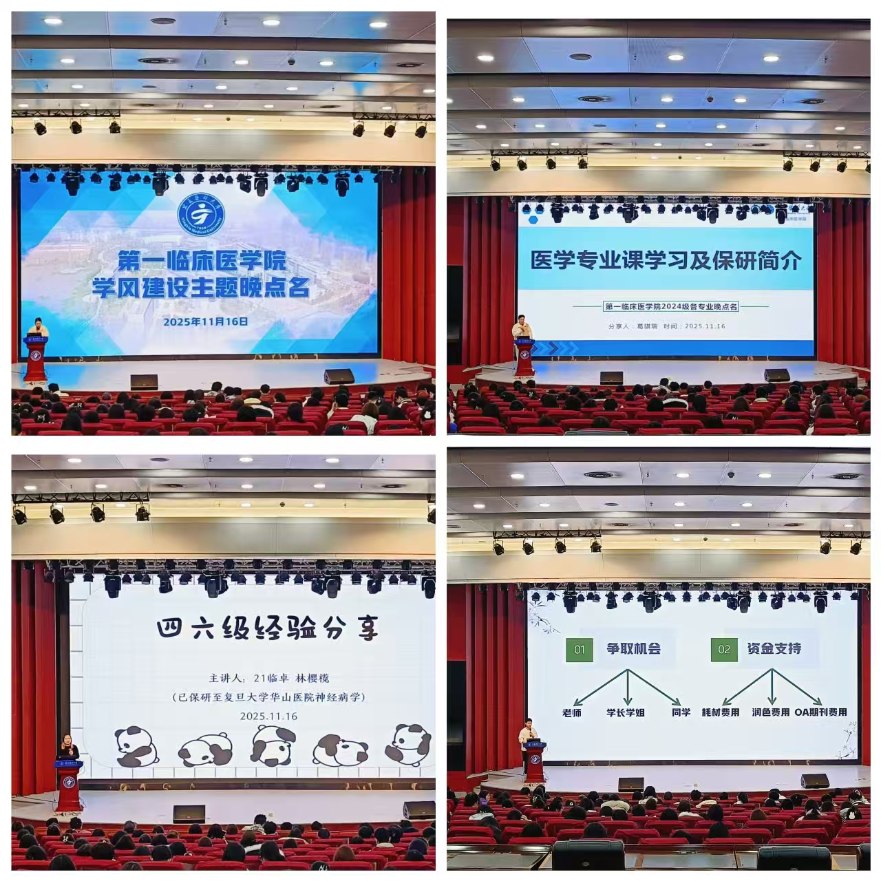 11月16日,第一临床医学院2024级举行学风建设主题晚点名暨保研经验分享会。本次晚点名邀请到学院21级葛骐瑞、林樱榄、王朝阳等同学围绕专业学习、英语备考、科研实践等方面为同学们传经送宝。