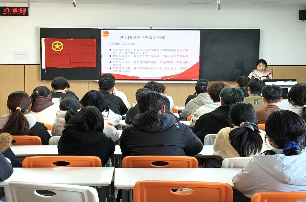 会议在团歌声中拉开序幕。团支部书记黎佳乐作年度工作总结,回顾了“国家安全 青春挺膺”“传承五四精神”等主题团课及“雷锋精神伴我行”等团日活动,严格落实“三会两制一课”,强化组织凝聚力。全体团员深入学习《中国共产主义共青团纪律处分条例(试行)》,从政治、组织、生活纪律等方面强化纪律意识。