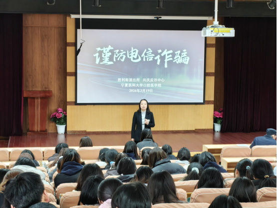 为提高学生防范电信网络诈骗的意识和能力,守护师生财产安全,2026年3月19日下午,口腔医学院邀请银川市公安局兴庆区分局反诈中心及胜利街派出所,在双怡校区学术报告厅开展防范电信诈骗专题宣讲活动。口腔医学院2024级和2025级共185名同学聆听讲座。