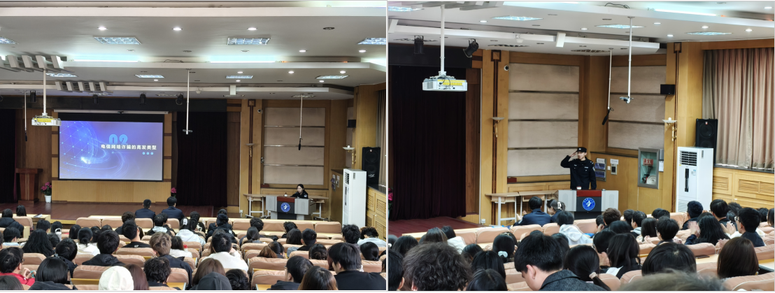 宣讲中,反诈中心杨杰警官阐释了电信网络诈骗的概念及严峻形势,指出其具有组织化、链条化、技术多变、跨境实施等特征,且会结合大数据精准设局。她结合大学生特点,剖析高发诈骗类型,通过真实案例还原过程,提醒学生警惕相关关键词,科普洗钱模式、受骗应对方法及防诈准则,同时普及相关法律知识,明确“两卡”交易的法律后果,警示学生切勿成为电诈“工具人”。