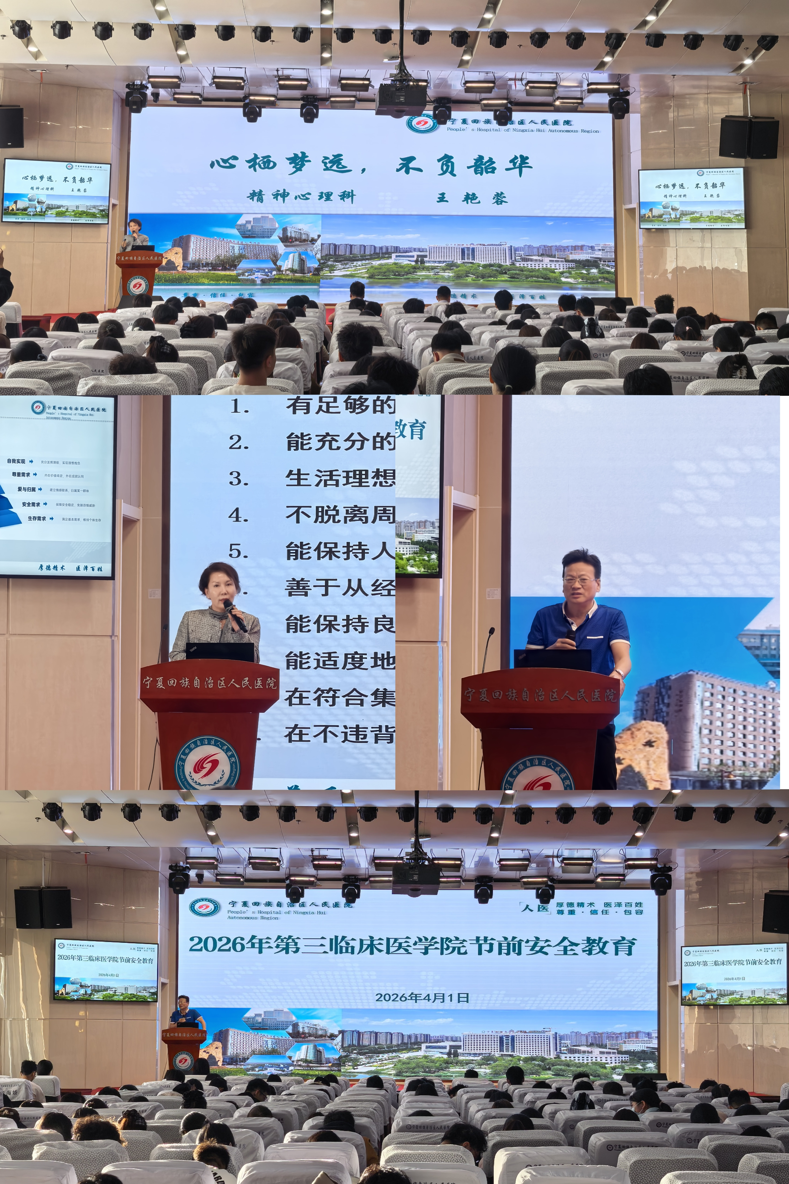 为切实关怀学生身心健康,强化安全防范意识,4月1日下午,第三临床医学院特邀宁夏回族自治区人民医院精神心理科负责人王艳蓉老师、学院专职组织员杜勇处长,先后为全体研究生、实习生以及见习生开展专题讲座。