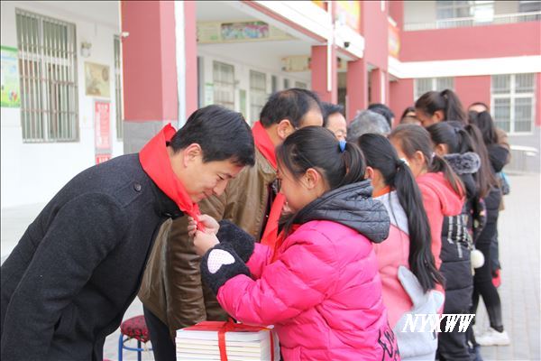 高沙窝小学学生为老师们佩戴红领巾