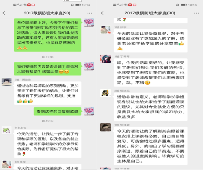 活动结束后,同学们仍在班级微信群中展开了热烈的讨论,表达了对此次活动的肯定,“导师说”系列活动更加坚定了同学们考研的信念,明确了同学们考研的目的和意义,对备考有了更详细可行的规划,为同学们考研的征程指明了方向,为同学们顺利抵达“下一站”助力!