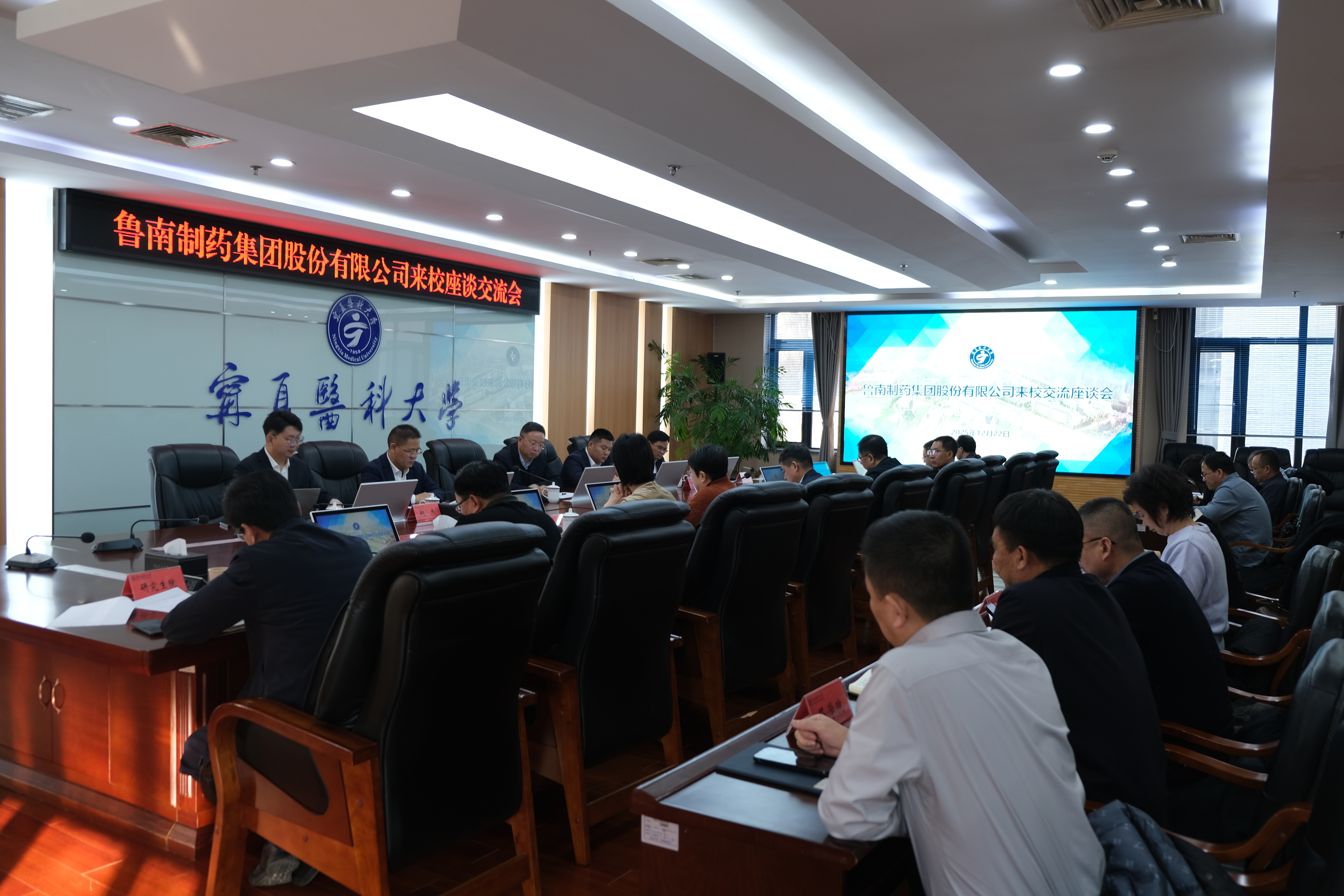 12月22日,鲁南制药集团股份有限公司一行来校交流座谈。学校党委副书记、校长姜怡邓,鲁南制药集团股份有限公司党委书记、董事长、总经理张贵民,自治区科技厅社会发展科技处副处长何琪,学校副校长杨怡,党委常委、副校长韩怀钦,学校及鲁南制药集团相关部门负责人参加座谈会。