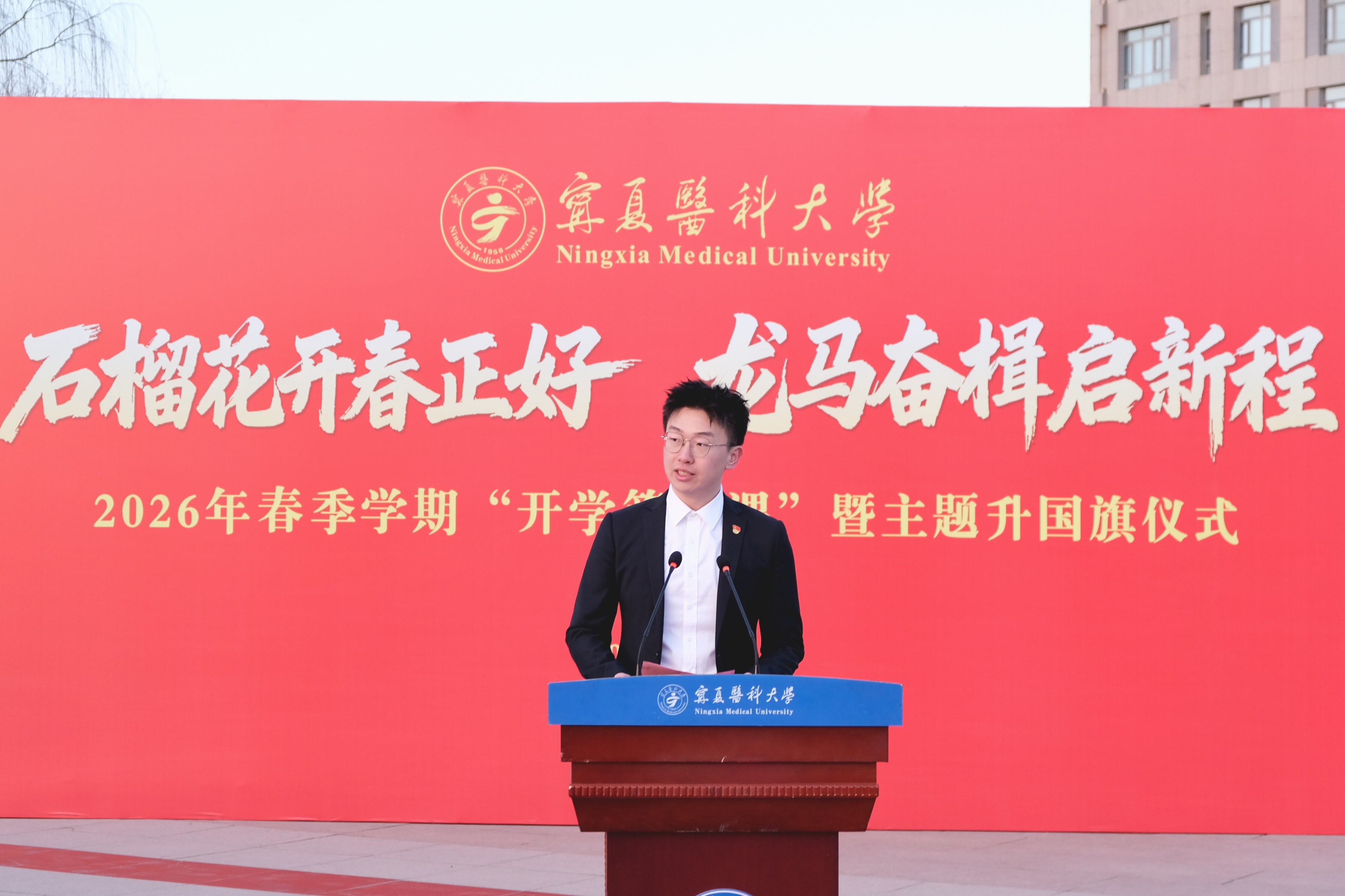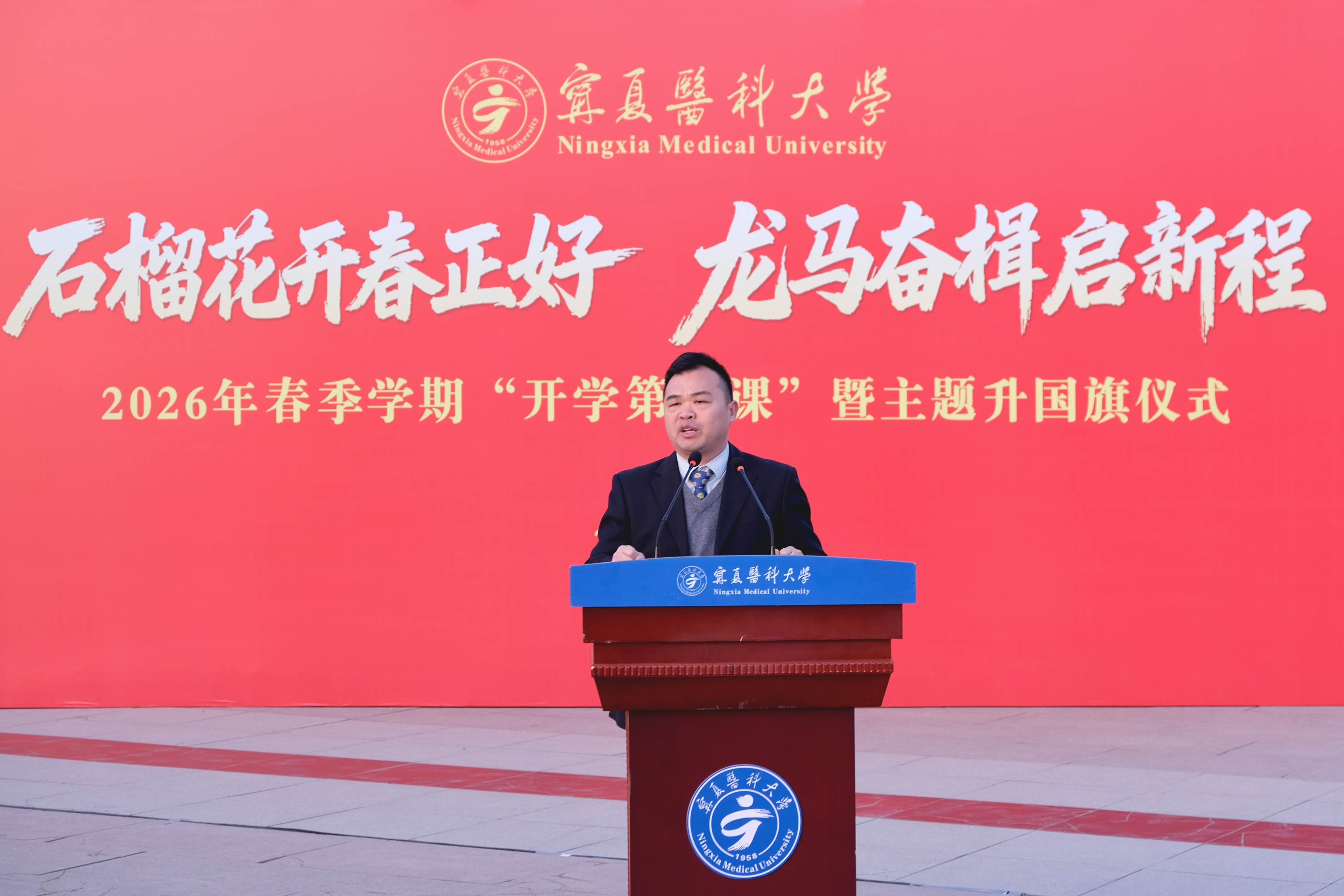 张治荣讲授“开学第一课”。他首先带领全体师生共同回首了学校“十四五”时期的峥嵘历程,细数了学校取得的历史性成绩。他勉励同学们要坚定理想信念,争做挺膺担当的新时代青年,把医学追求与报国之志紧密结合,将个人理想融入强国建设、民族复兴伟业,在守护人民生命健康的实践中,成长为国家所需、人民所盼的卓越医者。要凝聚奋进力量,争做知行合一的民族团结使者,以铸牢中华民族共同体意识为主线,站稳政治立场、坚守原则底线,自觉维护民族团结,共同守护宁医校园和谐的民族团结之花。要勤学善思笃行,直面人工智能时代医学事业的机遇与挑战,以“心中有梦”的清醒觉悟、“眼中有光”的求知热忱、“身上有汗”的昂扬状态、“手中有尺”的底线思维,勤学苦练、精进不怠,争做本领过硬、担当有为的新时代医学生。