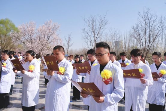 活动在庄重的氛围中拉开帷幕。学校国旗护卫队队员迈着整齐的步伐、敬献手中的花圈,向遗体捐献者寄托无限追思、表达由衷敬仰。基础医学院人体解剖学系马全瑞教授带领学生代表集体诵读《宁夏医科大学师生祭遗体捐献者文》,以文寄情、以声致哀,诉说对“无言良师”的崇敬之情与感恩之心。基础医学院院长党洁带领全体医学生庄严宣誓,重温《医学生誓言》。“健康所系,性命相托……”全体医学生神情肃穆、高举右拳,铮铮誓言,是对医学初心的再次坚守与承诺,更是对未来肩负救死扶伤重任的庄严宣告,充分彰显了新时代医学生投身医学事业、守护生命健康的坚定信念与责任担当。护理学院学生代表的手语表演《感恩的心》,无声的动作将那份跨越言语的感动,传递给现场的每一位参与者。低沉肃穆的乐曲缓缓流淌,全体人员依次走向生命之柱,深深鞠躬、驻足默哀,郑重献上手中的菊花,以最朴素的方式,寄托对遗体捐献者的缅怀与敬仰。