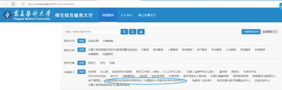 3.在流程服务大厅中搜索“宁夏医学科学研究所”点击或在所属部门处点击“宁夏医学科学研究所(宁夏医科大学医学科学技术研究中心)”,点击“宁夏医学科学研究所实验室(大型设备)准入申请”进入