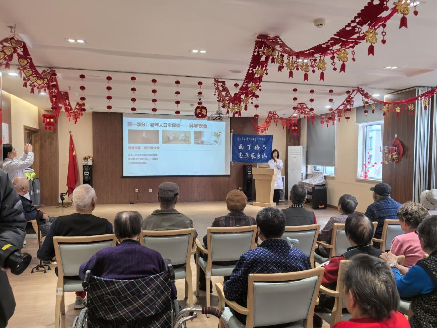 The initiative continued with a lecture on “Caring for Health, Enjoying a Happy Old Age,” focusing on senior wellness and stroke prevention. To deepen the impact, student volunteers also taught simple rehabilitation exercises to the elderly. Lastly, Teacher Hou Xiaohui led CPR training for care staff at the center. The simulation and hands-on practice helped them to master skills effectively.