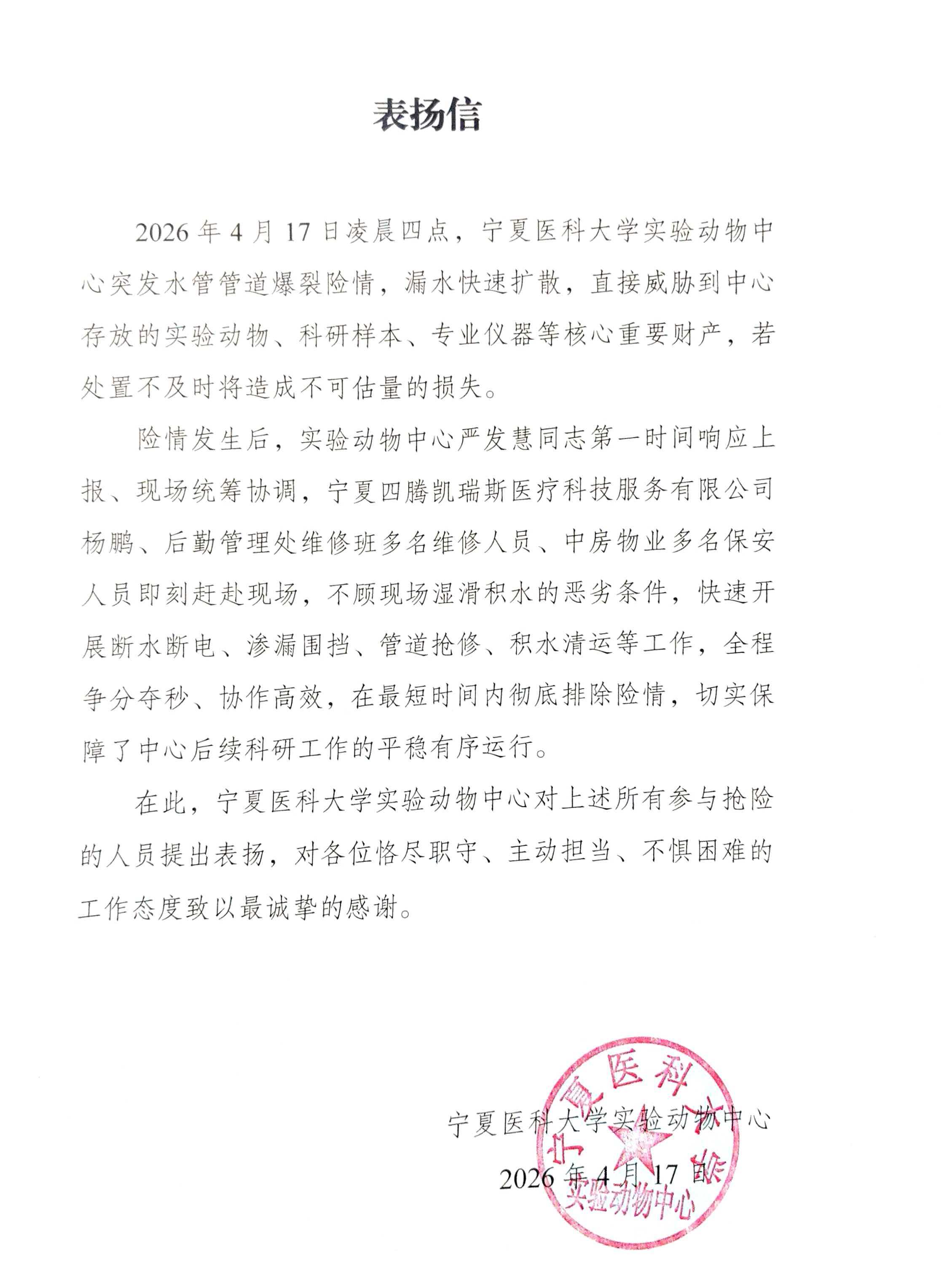 表扬信-实验动物中心