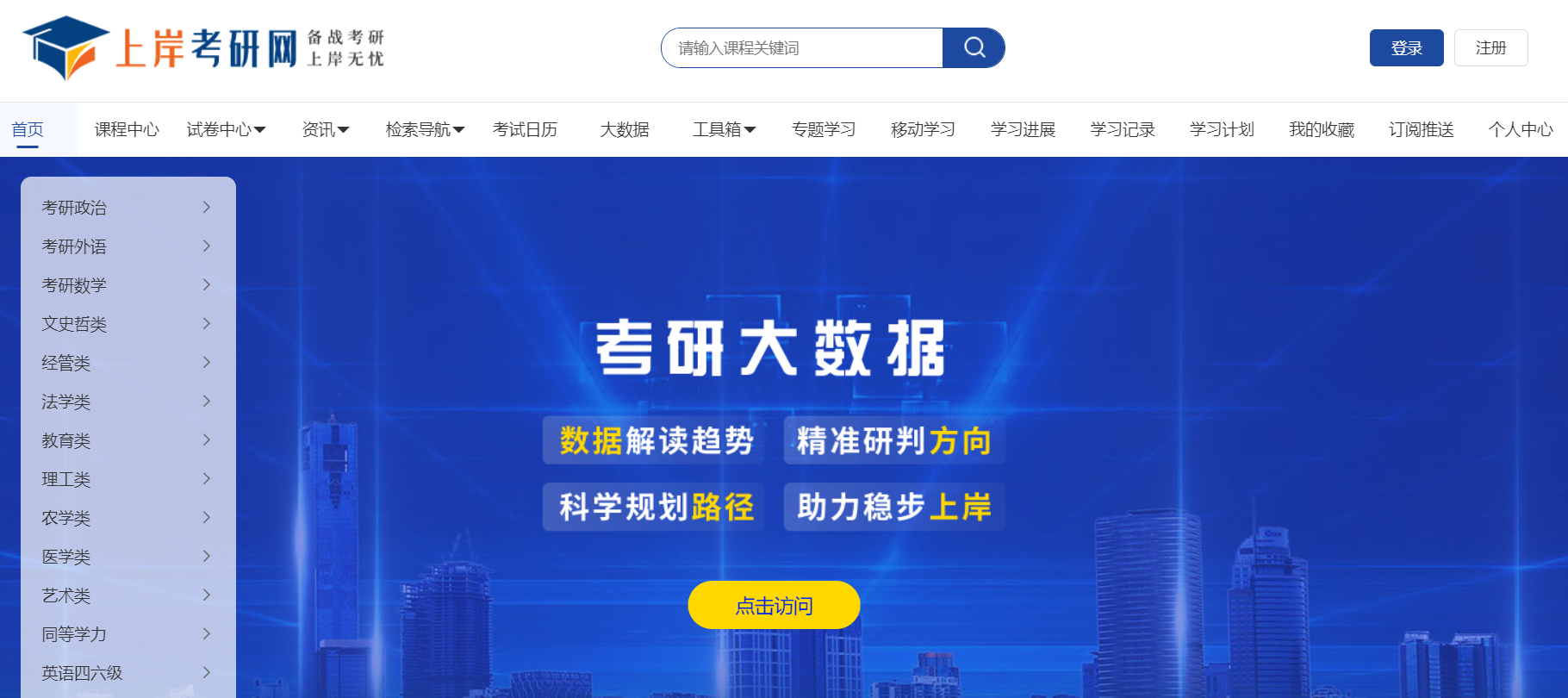 《上岸考研网》充分融合人工智能、云计算、大数据等先进数字技术,围绕用户学习行为数据与研究生考试动态数据进行双向匹配与深度分析,提供了课程学练、智能刷题系统、考研大数据、院校库、专业库与智能择校、学习过程管理等特色功能,构建出“学练结合-数据驱动-精准匹配-过程反馈”的智能化学习环境。