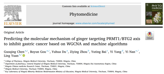 2025年7月25日,我校袁玲教授课题组在《Phytomedicine》期刊(影响因子8.3,中国科学院1区,Top期刊)发表题为“Predicting the molecular mechanism of ginger targeting PRMT1/BTG2 axis to inhibit gastric cancer based on WGCNA and machine algorithms”的研究论文。该研究揭示了PRMT1可作为生姜抗胃癌作用的生物标志物,并表明生姜可通过靶向PRMT1/BTG2轴发挥抗胃癌作用。研究成果为解析生姜抗胃癌的药理机制提供了新视角,为胃癌的靶向治疗发掘了潜在新靶点,也为系统阐明生姜多靶点抗癌作用机制提供了优先研究路径。